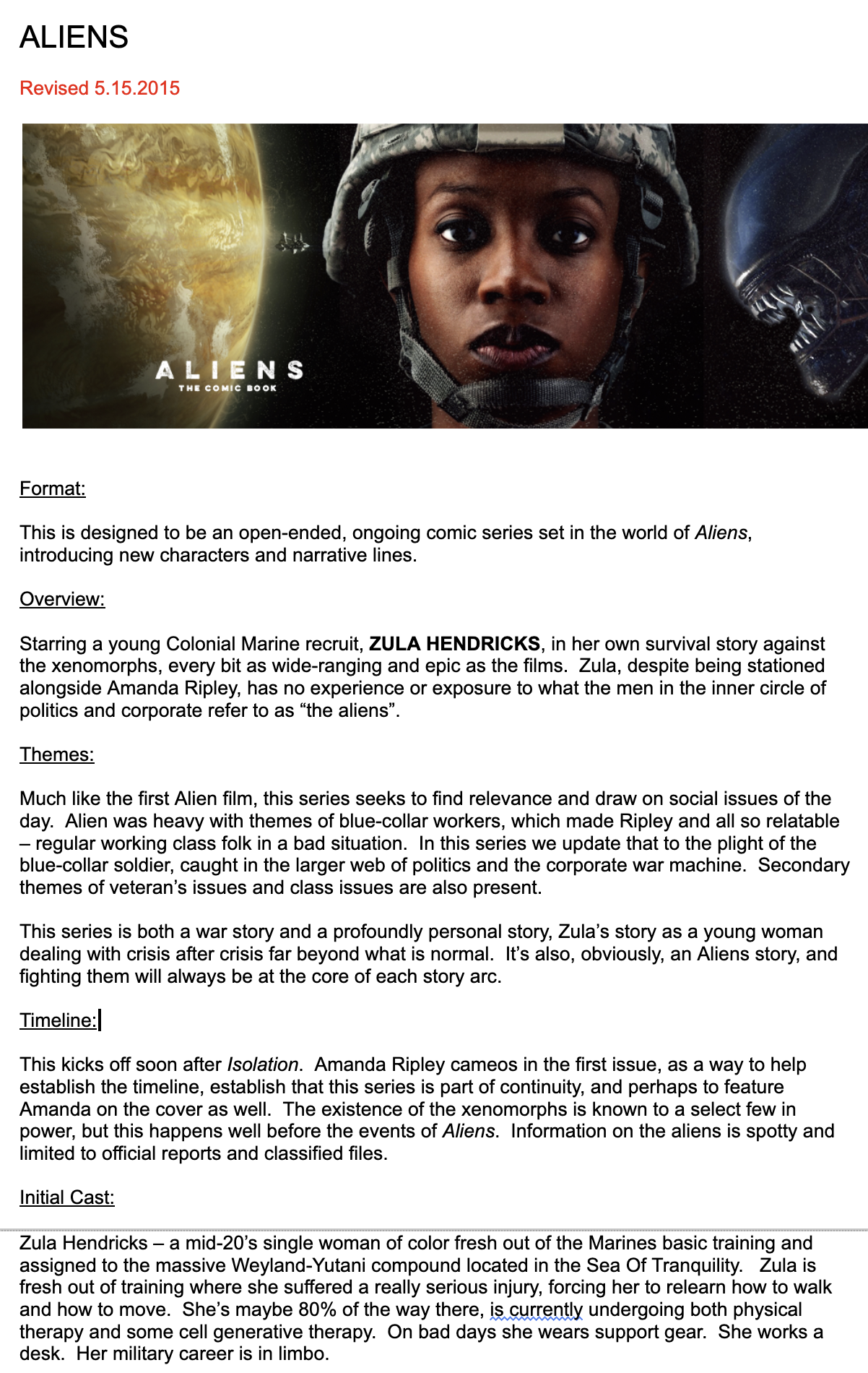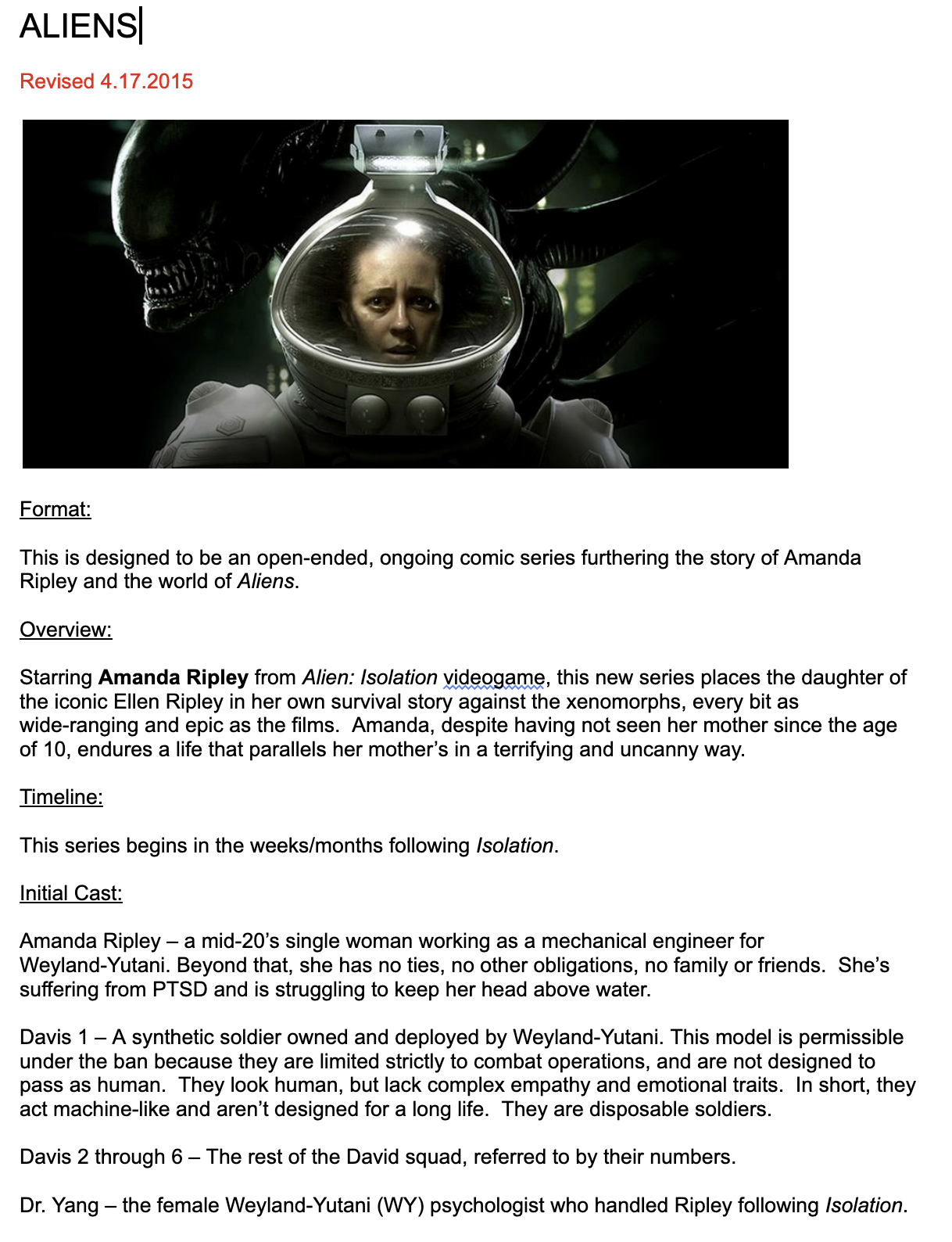I was approached in March of 2015 to write an ongoing Aliens comic book series. At first the mandate was to write an Ellen Ripley story. Then that was changed to an Amanda Ripley story. The entity making these preliminary decisions was Fox Interactive.